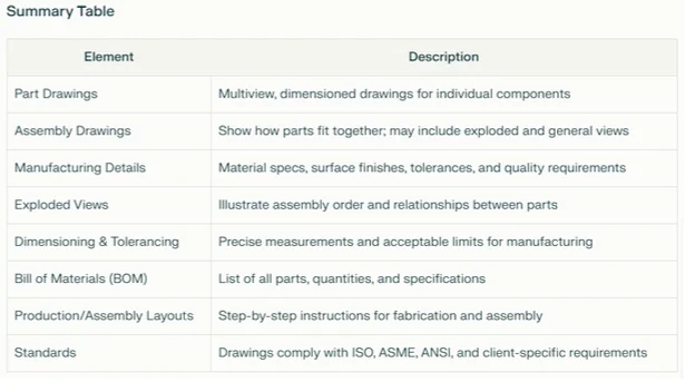 Production drawings provide step-by-step instructions for fabrication, while assembly layout drawings guide the correct placement and connection of parts during assembly. These documents are structured and annotated according to industry and client-specific standards for clarity and consistency.